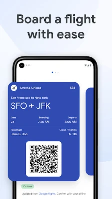 + Make boarding flights a breeze with the latest information pulled from Google Search. Google Wallet can keep you posted on gate changes or unexpected flight delays.