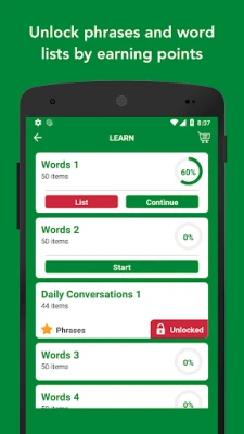 - Earn points by learning and practicing. Then unlock phrases and word lists.